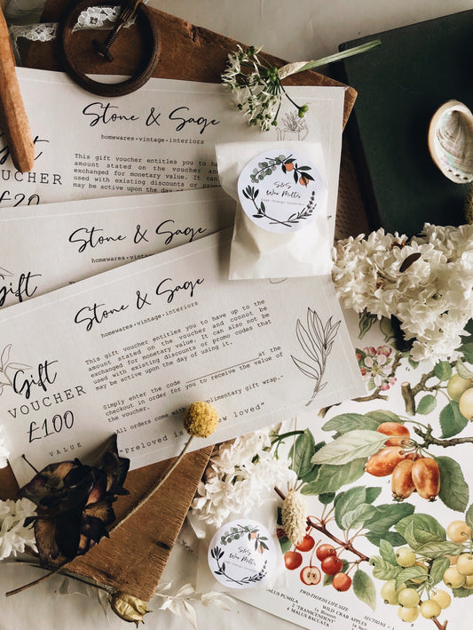 Give the gift of vintage treasures this Christmas with one of Stone and Sage’s festive vouchers. The lucky recipient can choose their favourite items or treasures from our online store. All orders will arrive with a complimentary gift wrap, S&S style!