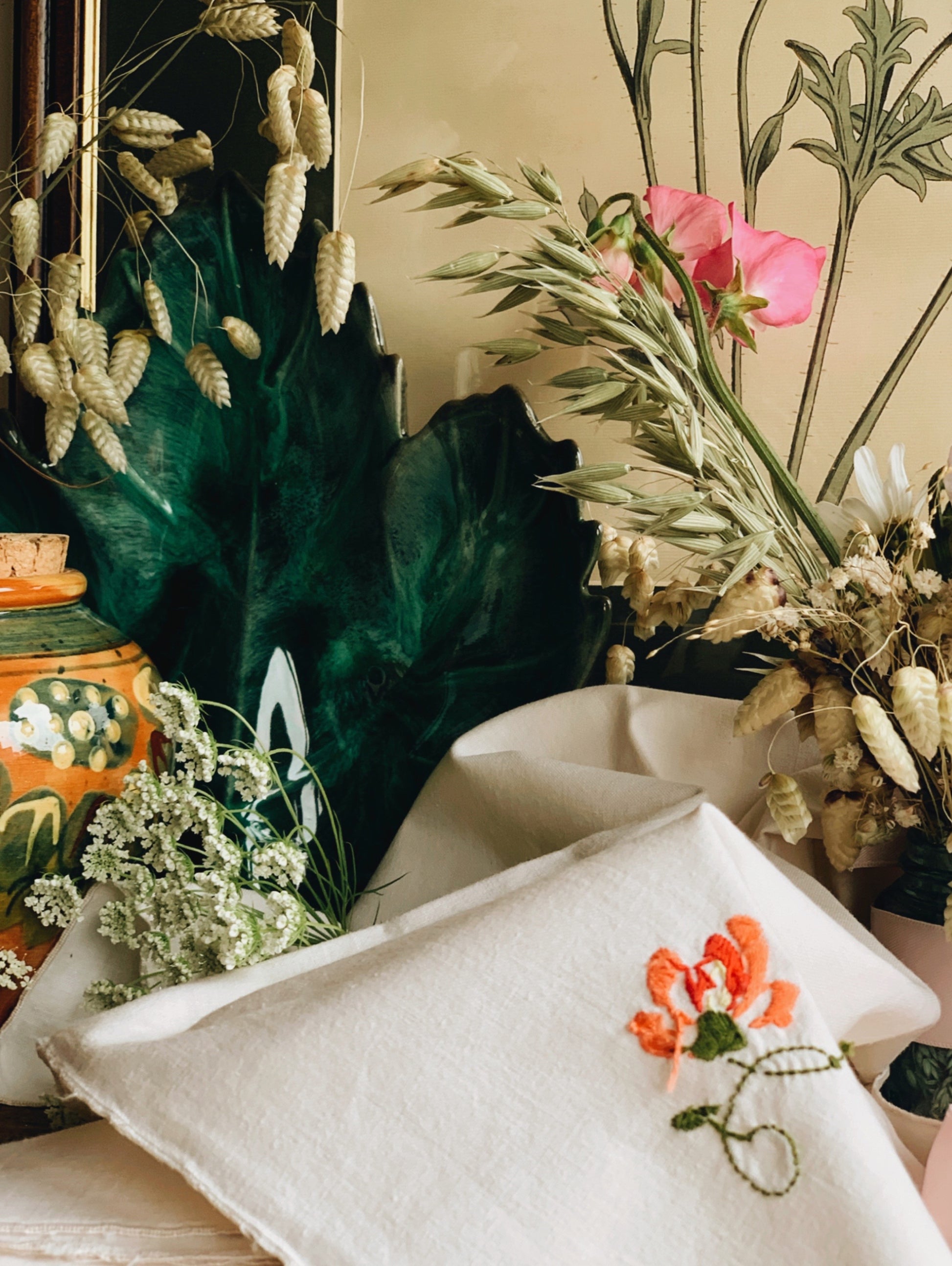 Pop the linens on a coffee table in the garden with a fresh sprig of summer pickings from the garden, perfecto.